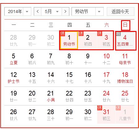 5月1日(星期四)、5月2日(星期五)、5月3日(星期六)共放假3天,5月4日(星期日)正常上班。