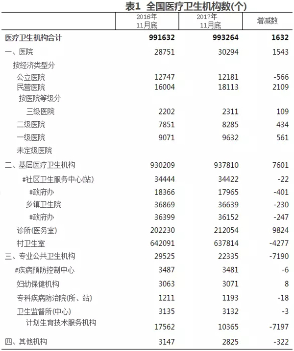 截至2017年11月底,全國醫(yī)療衛(wèi)生機(jī)構(gòu)數(shù)達(dá)99.3萬個(gè)。與2016年11月底比較,全國醫(yī)療衛(wèi)生機(jī)構(gòu)增加1632個(gè),其中:醫(yī)院增加1543個(gè),基層醫(yī)療衛(wèi)生機(jī)構(gòu)增加7601個(gè),專業(yè)公共衛(wèi)生機(jī)構(gòu)減少7190個(gè)。