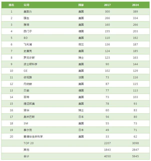 在全球銷售前20名醫(yī)療器械公司中,位居榜首的美敦力在2017年的銷售額為300億美元,到2024年年銷售額預計將達到389億美元,仍將位居第一;雅培因為2017年1月初完成收購圣猶達,2017年銷售收入大幅增長60.9%,成為全球第三大醫(yī)療設備制造商;BD在2017年收入負增長3.6%,是前20強中唯一一家收入下滑的公司,主要因為在2016年10月完成了剝離呼吸解決方案業(yè)務。