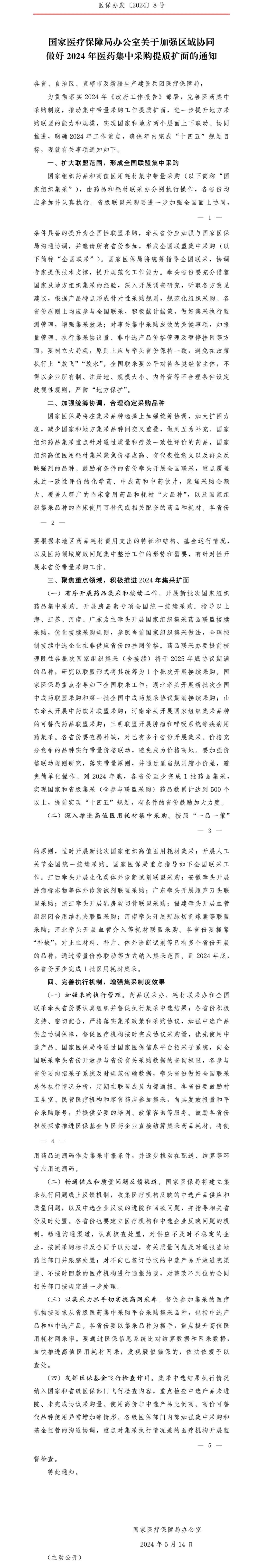 今天(5月20日)下午,國家醫(yī)保局發(fā)布重磅文件《國家醫(yī)療保障局辦公室關(guān)于加強區(qū)域協(xié)同做好2024年醫(yī)藥集中采購提質(zhì)擴面的通知》(全文附文末),2024年耗材集采全面升級,新任務(wù)正式揭曉。