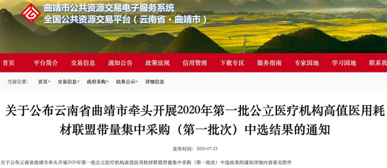 醫(yī)藥網(wǎng)7月27日訊 7月23日,云南省曲靖市牽頭開展2020年第一批公立醫(yī)療機構(gòu)高值醫(yī)用耗材聯(lián)盟帶量集中采購(第一批次)中選結(jié)果公布。