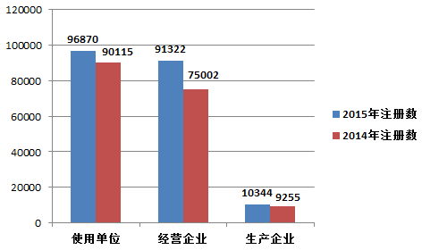 2015年,注冊(cè)基層用戶(包括醫(yī)療器械生產(chǎn)企業(yè)、經(jīng)營(yíng)企業(yè)和使用單位)總數(shù)比2014年增長(zhǎng)了13.9%。其中,醫(yī)療器械生產(chǎn)企業(yè)、經(jīng)營(yíng)企業(yè)和使用單位的注冊(cè)基層用戶分別比2014年增長(zhǎng)了11.8%、21.8%和7.5%(圖1-5)。
