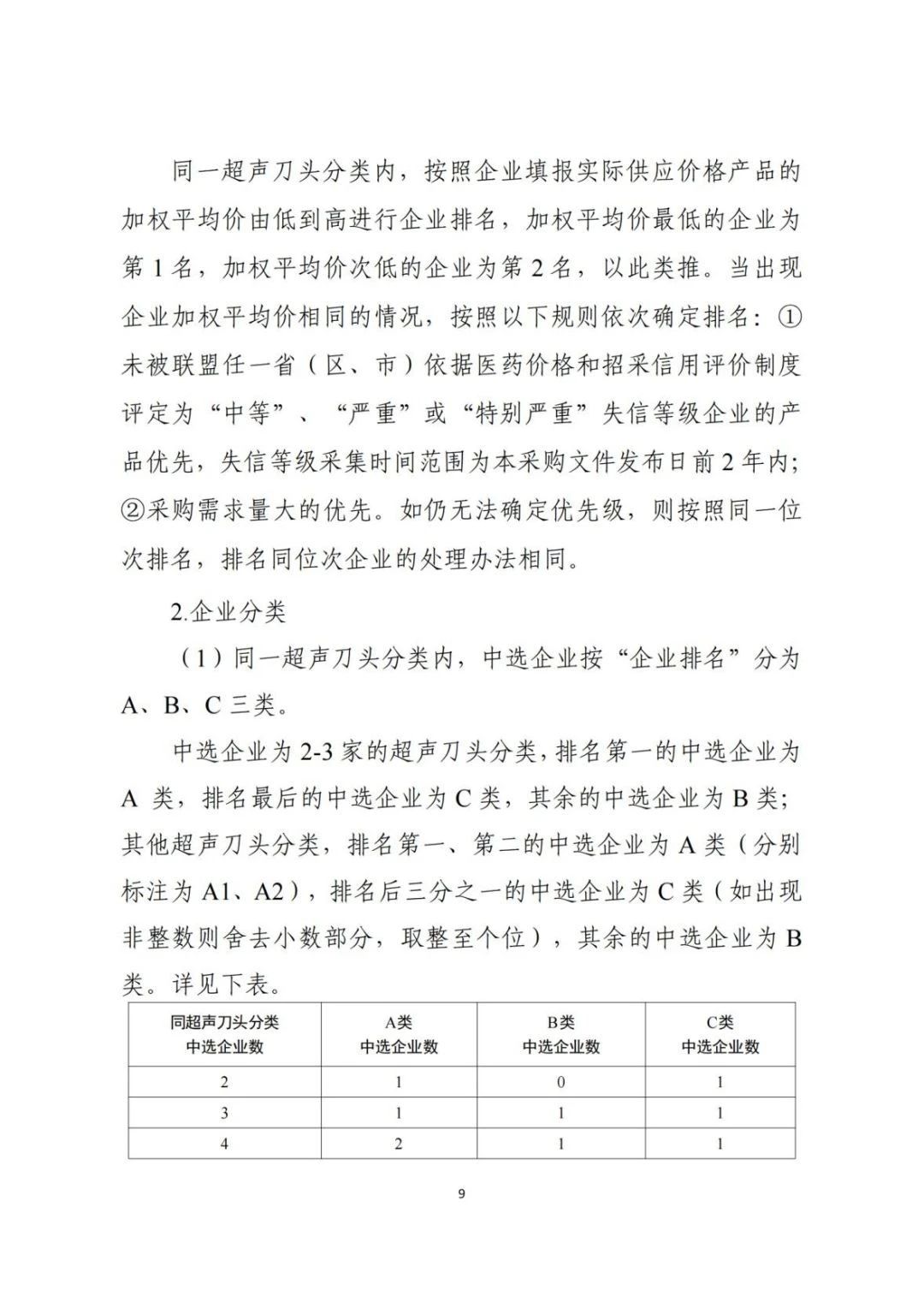 同一超聲刀頭分類內(nèi),中選企業(yè)按“企業(yè)排名”分為A、B、C三類,未中選的企業(yè)為D類,中選企業(yè)未報價的產(chǎn)品也視為D類,分類情況與協(xié)議采購量直接掛鉤(具體分配規(guī)則見文末)。