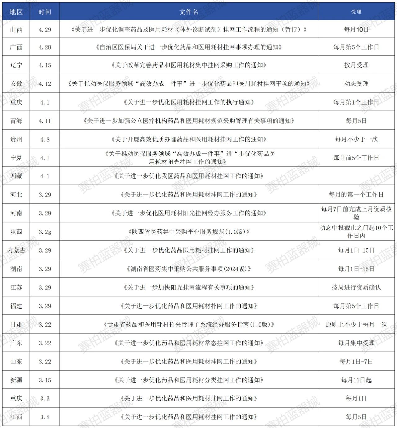 據(jù)賽柏藍(lán)器械不完全統(tǒng)計(jì),截止目前已有超過(guò)20省發(fā)布有關(guān)優(yōu)化耗材掛網(wǎng)流程的相關(guān)通知,具體如下: