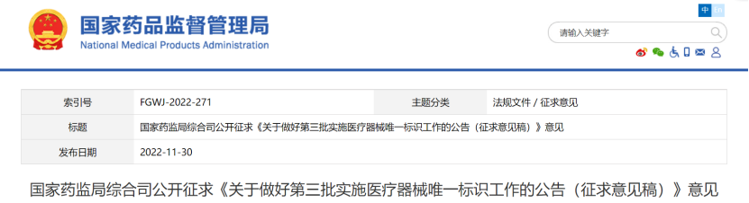 11月30日,國家藥監(jiān)局綜合司發(fā)布《關(guān)于做好第三批實(shí)施醫(yī)療器械唯一標(biāo)識(shí)工作的公告(征求意見稿)》(以下簡稱《征求意見稿》)。
