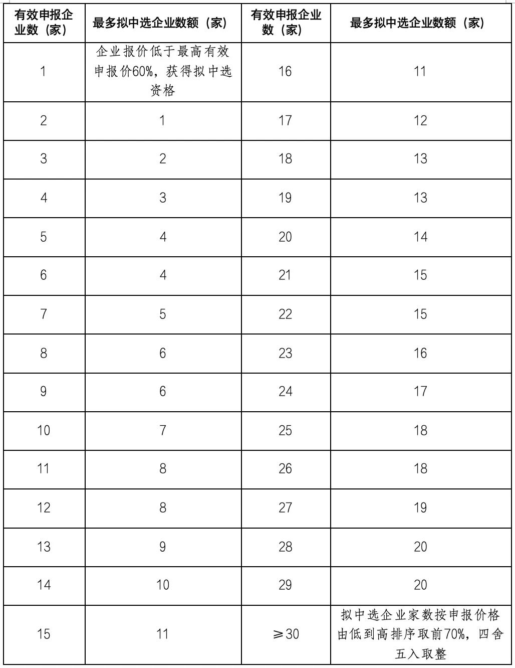 各競(jìng)價(jià)組按市場(chǎng)占有率分為A、B兩個(gè)競(jìng)價(jià)單元,同一競(jìng)價(jià)單元內(nèi),依據(jù)申報(bào)企業(yè)報(bào)價(jià)由低到高進(jìn)行排名,擬中選企業(yè)取數(shù)表如下: