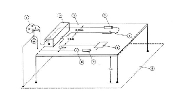 試驗(yàn)1——依次對(duì)帶有如圖104所示的電極電纜和電極的高頻手術(shù)設(shè)備的每一個(gè)輸出進(jìn)行試驗(yàn)。兩電纜間隔為0.5m,置于離接地導(dǎo)電平面上方1m的絕緣表面上。輸出端帶200Ω負(fù)載,高頻手術(shù)設(shè)備每一個(gè)工作模式以最大輸出設(shè)定運(yùn)行,測(cè)量從中性電極經(jīng)200Ω無(wú)感電阻流向地的高頻漏電流。