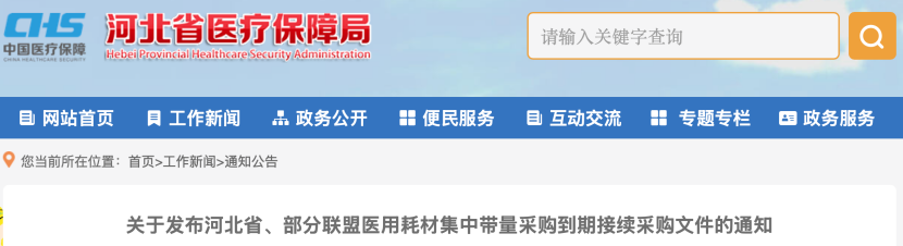 2月8日,河北省醫(yī)保局發(fā)布《關(guān)于發(fā)布河北省、部分聯(lián)盟醫(yī)用耗材集中帶量采購(gòu)到期接續(xù)采購(gòu)文件的通知》(附文末)。