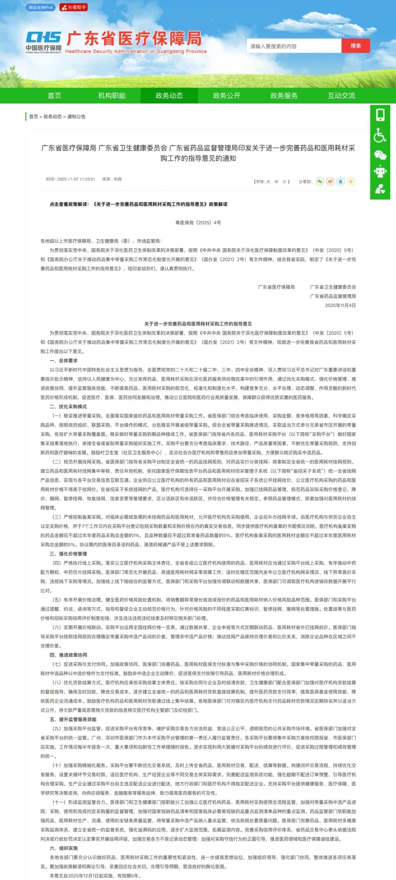 近日,廣東醫(yī)保局官網(wǎng)發(fā)布《關(guān)于進一步完善藥品和醫(yī)用耗材采購工作的指導(dǎo)意見的通知》(簡稱《通知》,完整見文末),自2025年12月1日起實施,有效期5年。