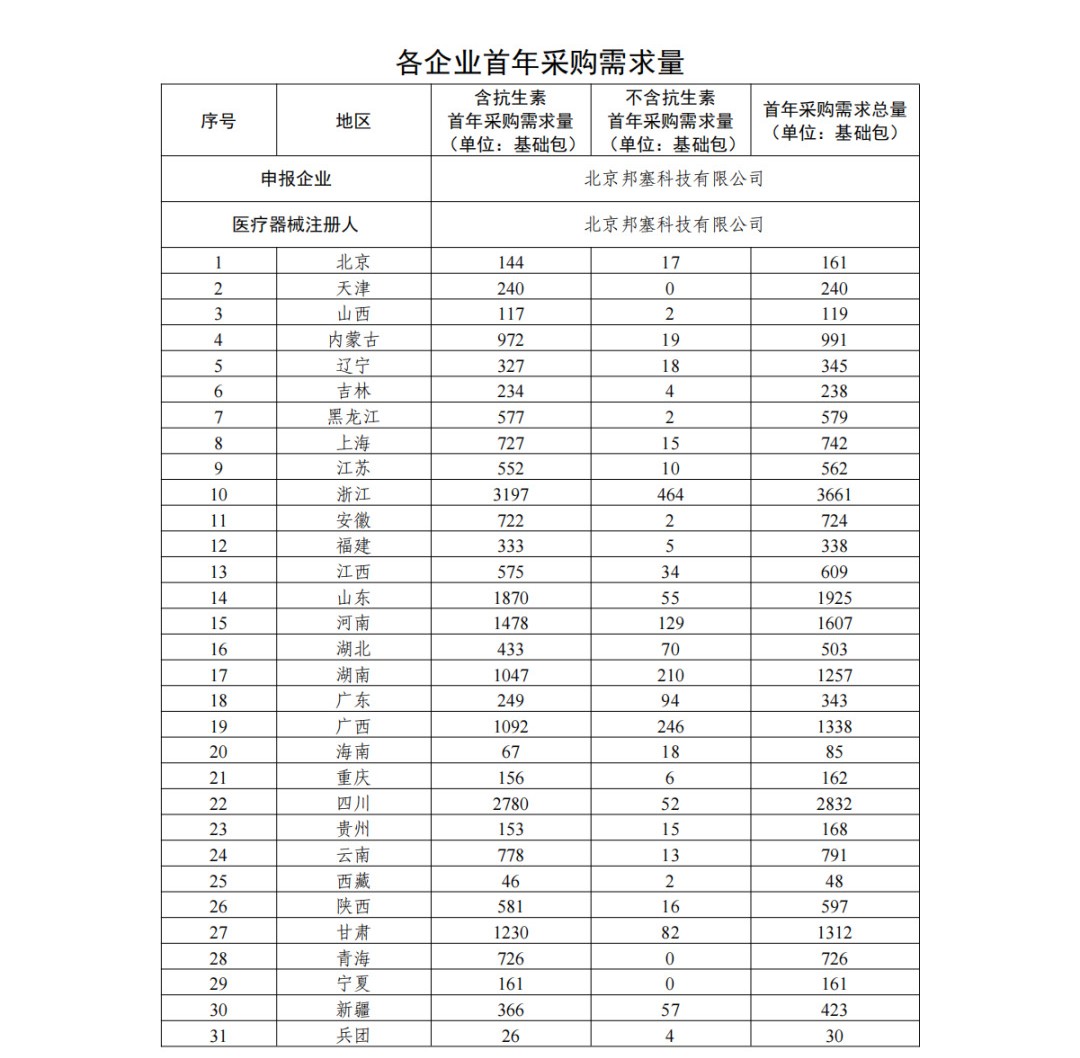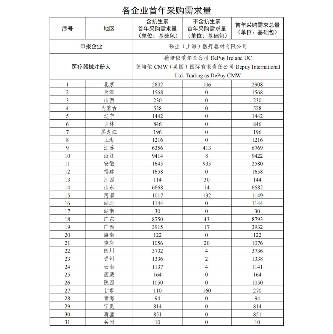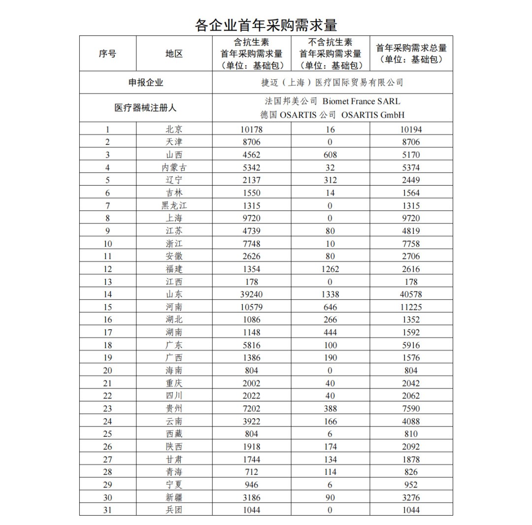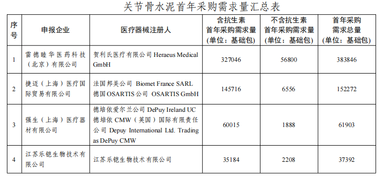 首年采購需求總量為673213個(gè)基礎(chǔ)包,其中關(guān)節(jié)骨水泥(含抗生素)需求總量為 595241 個(gè)基礎(chǔ)包,關(guān)節(jié)骨水泥(不含抗生素)需求總量為 77972 個(gè)基礎(chǔ)包。