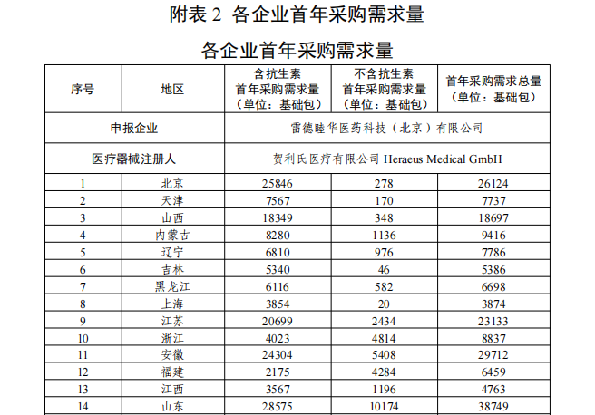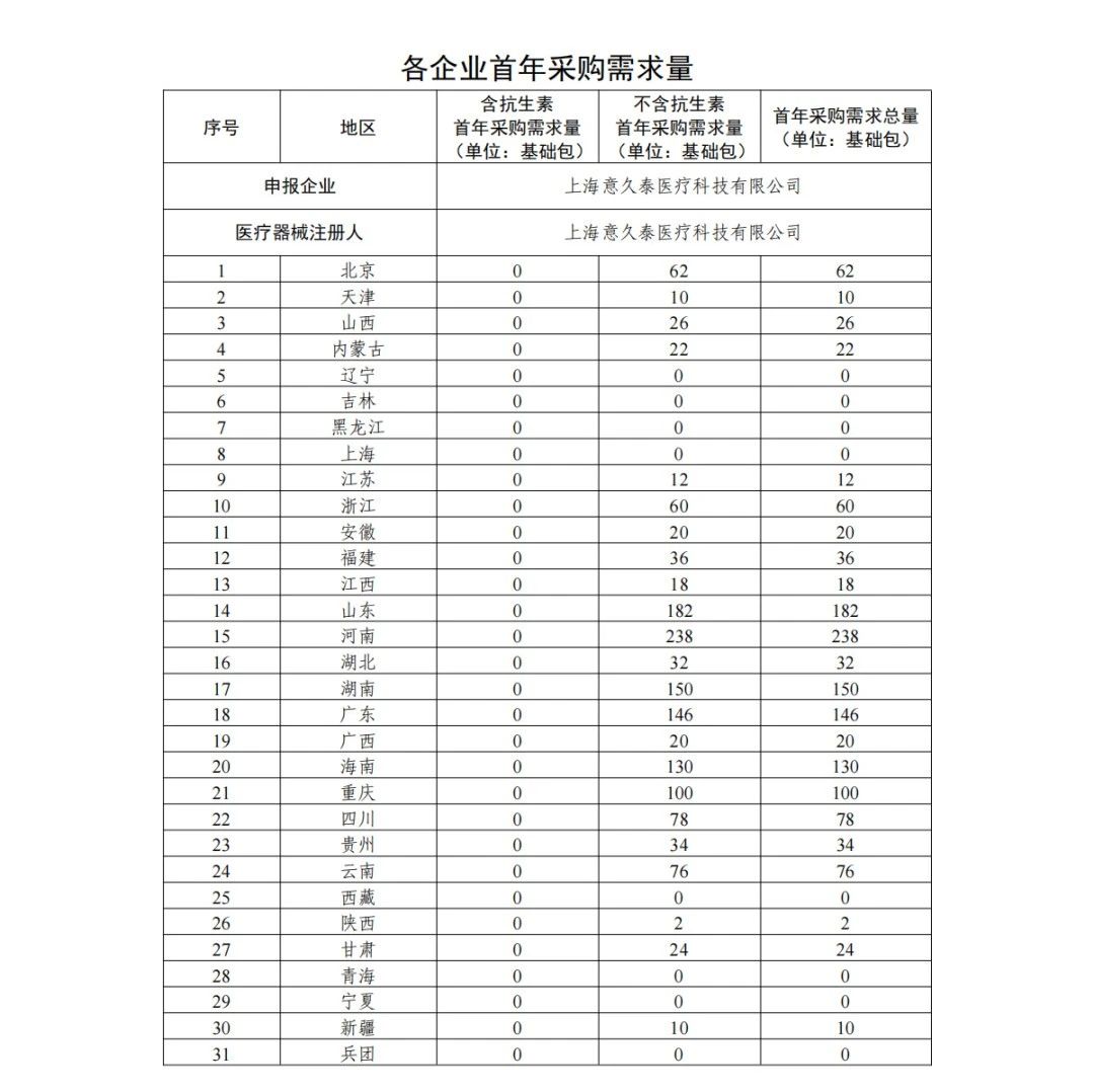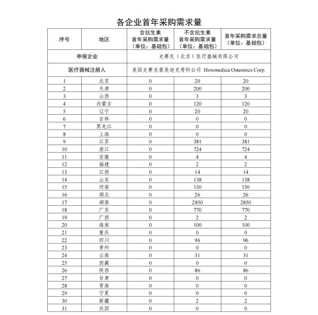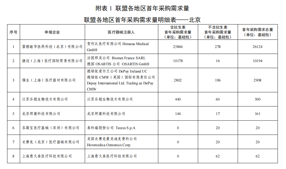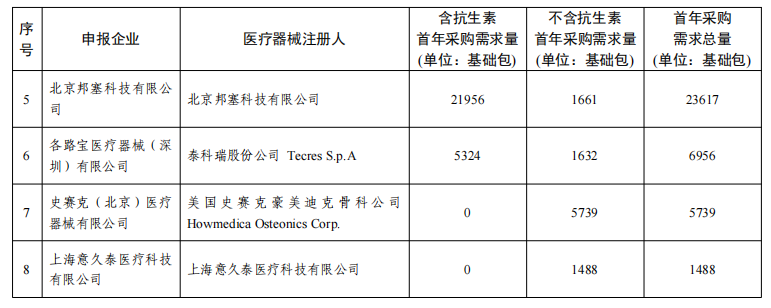 首年采購需求總量為673213個(gè)基礎(chǔ)包,其中關(guān)節(jié)骨水泥(含抗生素)需求總量為 595241 個(gè)基礎(chǔ)包,關(guān)節(jié)骨水泥(不含抗生素)需求總量為 77972 個(gè)基礎(chǔ)包。