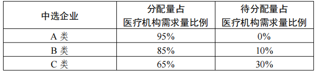第一步:醫(yī)療機(jī)構(gòu)填報(bào)采購需求量的產(chǎn)品若在中選范圍,根據(jù)以下規(guī)則按比例分配采購需求量。申報(bào)企業(yè)按中選排名由低到高進(jìn)行排序,排序前 40%(具體數(shù)量向上取整)的企業(yè)為A類,按采購需求量的95%分量;排序40%(具體數(shù)量向上取整再加1)至70%(具體數(shù)量向上取整)的企業(yè)為B類,按采購需求量的85%分量;其他中選企業(yè)為C類,按采購需求量的65%分量。