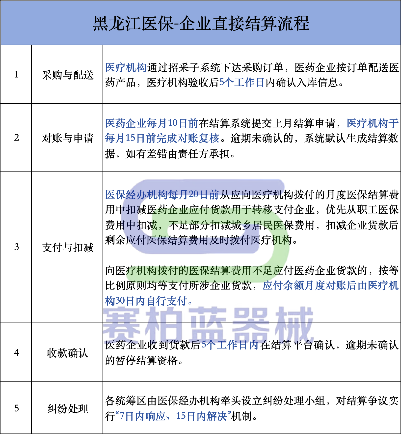 結(jié)算流程共分5步,包括采購(gòu)與配送、對(duì)賬與申請(qǐng)、支付與扣減、收款確認(rèn)以及糾紛處理,醫(yī)療機(jī)構(gòu)、醫(yī)藥企業(yè)、醫(yī)保經(jīng)辦機(jī)構(gòu)分工明確,各流程均設(shè)置截止時(shí)間。具體如下:
