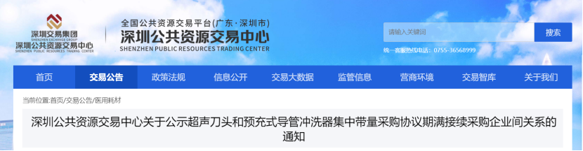 12月12日,深圳公共資源交易中心發(fā)布《深圳公共資源交易中心關(guān)于公示超聲刀頭和預(yù)充式導(dǎo)管沖洗器集中帶量采購協(xié)議期滿接續(xù)采購企業(yè)間關(guān)系的通知》(名單見文末),于2024年12月12日-2024年12月17日17:00進(jìn)行公示。