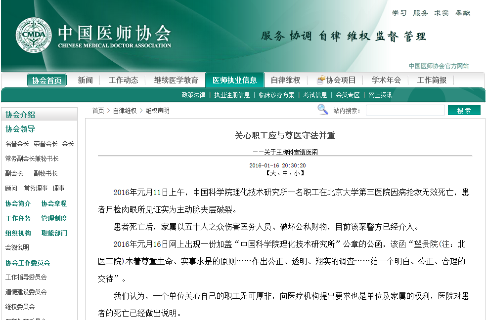 中國醫(yī)師協(xié)會(huì)呼吁:關(guān)心職工應(yīng)與尊醫(yī)守法并重 兩家涉事機(jī)構(gòu)發(fā)布聲明