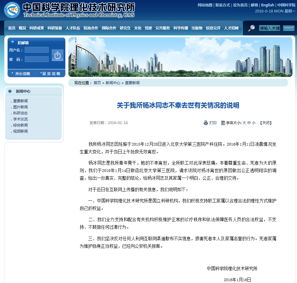 幾乎同時(shí),患者生前所在單位中科院理化所也發(fā)布了《關(guān)于我所楊冰同志不幸去世有關(guān)情況的說明》。