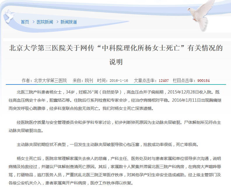 今天 18 時(shí)左右,北醫(yī)三院發(fā)布《北京大學(xué)第三醫(yī)院關(guān)于網(wǎng)傳「中科院理化所楊女士死亡」有關(guān)情況的說明》。