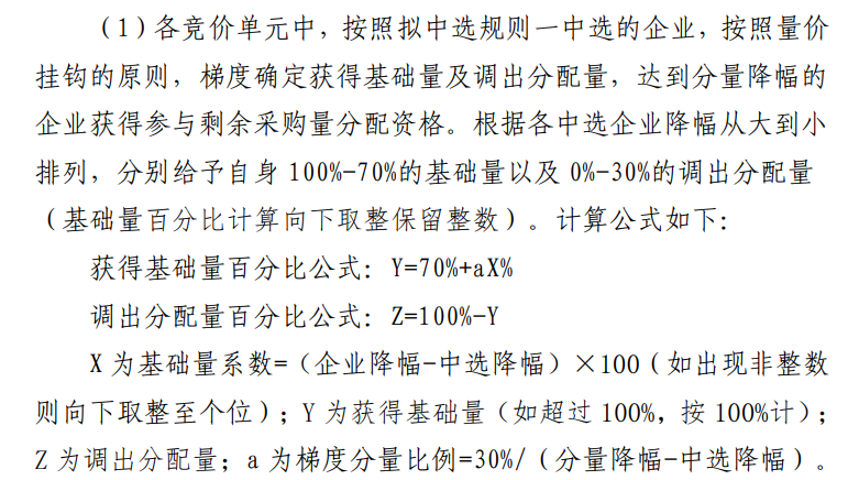 (1)擬中選規(guī)則一:同一競(jìng)價(jià)單元內(nèi),企業(yè)降幅達(dá)相應(yīng)中選降幅要求的企業(yè)獲得擬中選資格。