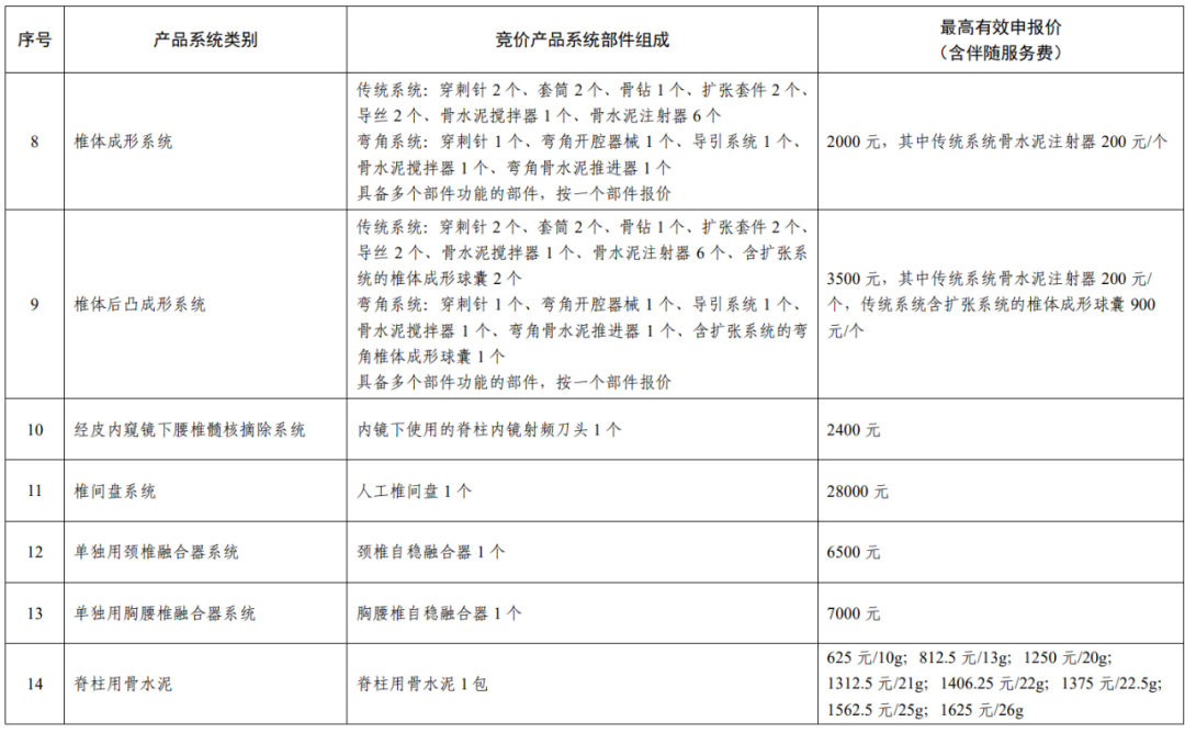 本次集采中,各產(chǎn)品系統(tǒng)類別主要部件按如下規(guī)則組成競價產(chǎn)品系統(tǒng),對應(yīng)最高有效申報價(含伴隨服務(wù)費,骨水泥除外)如下: