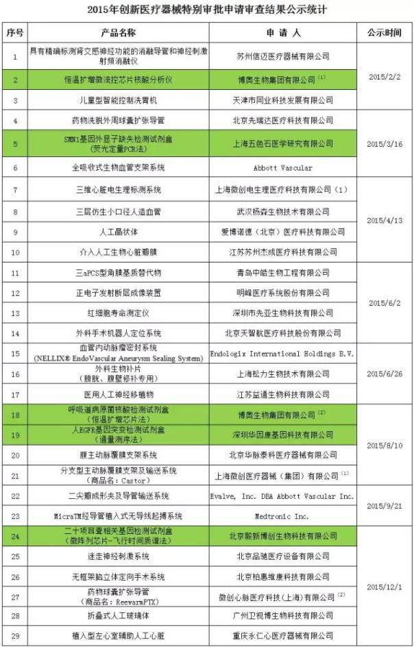 2015年共有29項產(chǎn)品進入CFDA創(chuàng)新醫(yī)療器械特別審批申請審查,其中上海微創(chuàng)有2項產(chǎn)品入圍,關(guān)于體外診斷的項目(背景為綠色)共有5項。