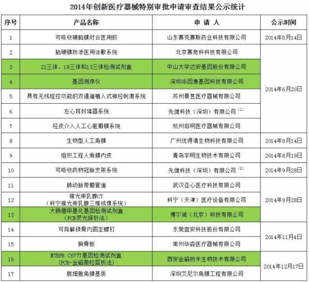 2014年共有17項產(chǎn)品進入CFDA創(chuàng)新醫(yī)療器械特別審批申請審查,其中先健科技(深圳)有限公司有2項產(chǎn)品入圍,關(guān)于體外診斷的項目(背景為綠色)共有4項。