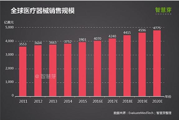 根據(jù)EvaluateMedTech的統(tǒng)計(jì),2011-2015全球醫(yī)療器械銷售規(guī)模呈現(xiàn)穩(wěn)步上升趨勢。2015年,銷售額達(dá)到3900億美元以上。預(yù)計(jì)該市場規(guī)模在2020年增長至4775億美元,2015-2020期間將呈現(xiàn)4.1%的年均復(fù)合增長率。