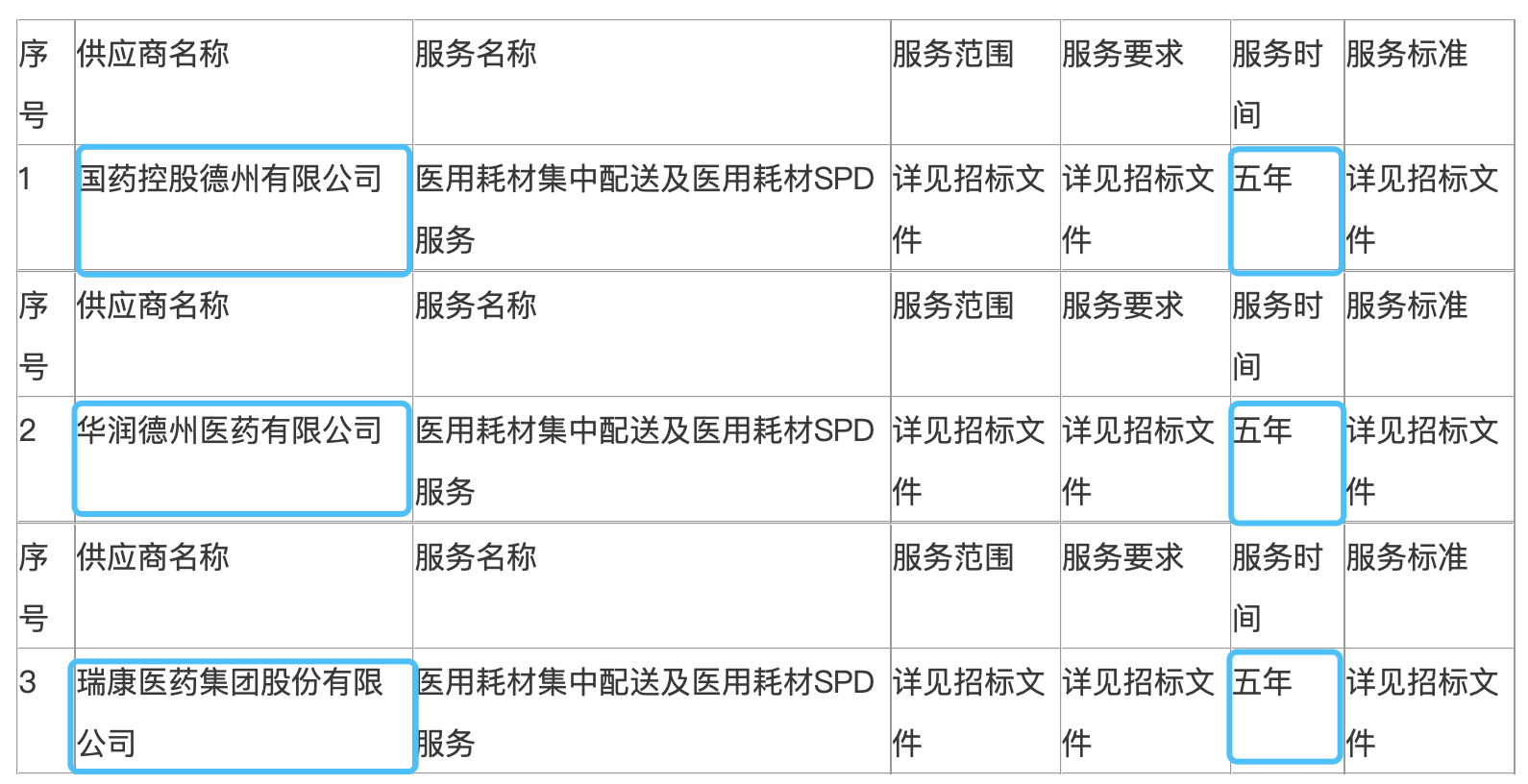 文件指出,平原縣第一人民醫(yī)院的年度耗材、試劑采購(gòu)預(yù)算金額為4000萬(wàn)元,服務(wù)周期為5年,總金額為2億。國(guó)藥控股德州有限公司、華潤(rùn)德州醫(yī)藥有限公司、瑞康醫(yī)藥集團(tuán)股份有限公司3家企業(yè)中標(biāo)。
