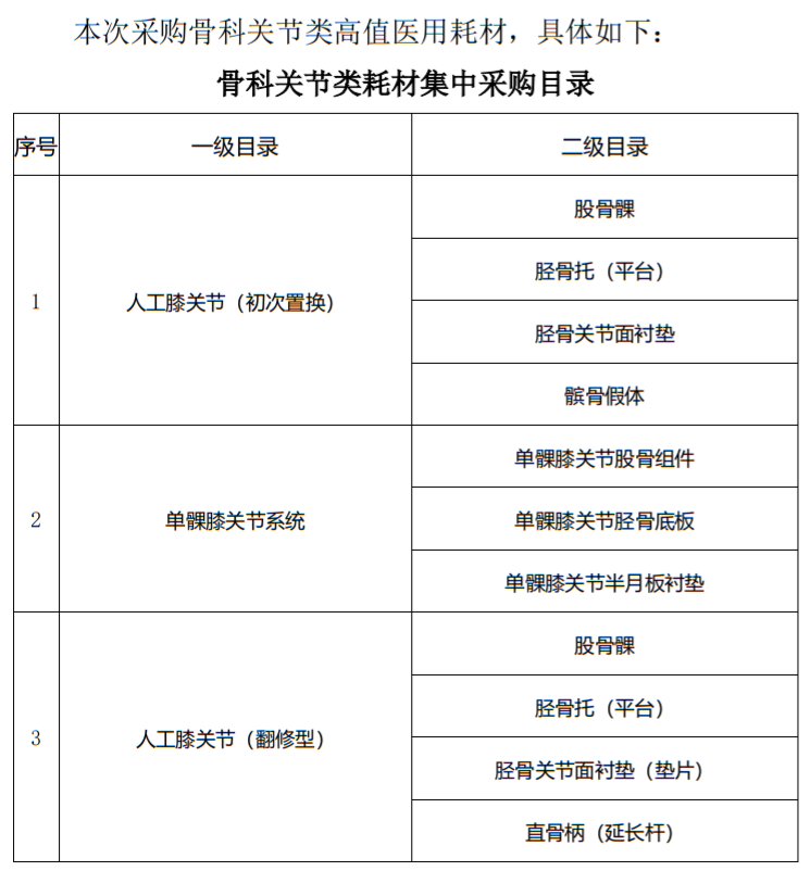 具體涉及人工膝關(guān)節(jié)、單髁膝關(guān)節(jié)系統(tǒng)、人工髖關(guān)節(jié)、假體周圍骨折鋼板、一次性骨水泥真空攪拌套件等29大類54個品種的骨科耗材。
