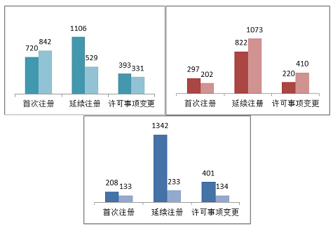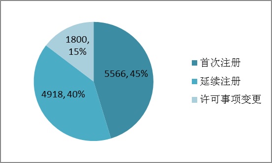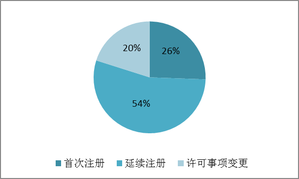 按注冊形式區(qū)分,首次注冊申請2402項,延續(xù)注冊申請5105項,許可事項變更申請1889項。