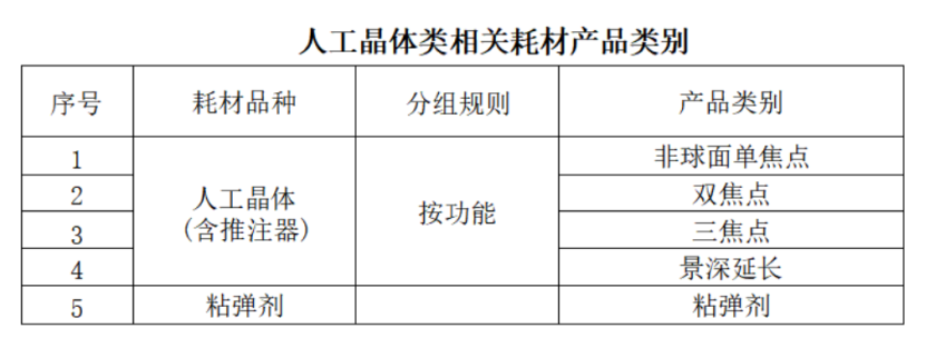 1.人工晶體類相關(guān)耗材: 獲得中華人民共和國(guó)醫(yī)療器械注冊(cè)證的人工晶體耗材(不包括硬性人工晶體、有晶體眼人工晶體,下同 )、粘彈劑。人工晶體耗材須包含可與其配套使用的推注器。