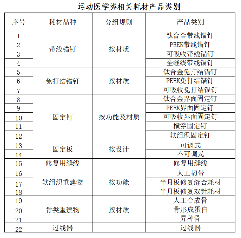 2.運(yùn)動(dòng)醫(yī)學(xué)類相關(guān)耗材: 獲得中華人民共和國(guó)醫(yī)療器械注冊(cè)證的帶線錨釘、免打結(jié)錨釘、界面固定釘、橫穿固定釘、軟組織固定釘、可調(diào)式固定板、不可調(diào)式固定板、修復(fù)用縫線、人工韌帶、半月板修復(fù)縫合耗材、半月板修復(fù)雙針耗材、人工合成骨、骨形成蛋白、異種骨、過線器。