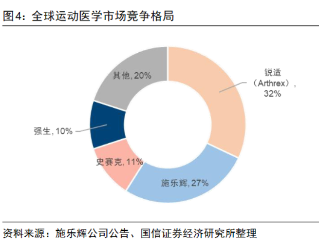 根據(jù) Orthoworld 統(tǒng)計(jì),2022 年預(yù)計(jì)全球運(yùn)動(dòng)醫(yī)學(xué)市場(chǎng)規(guī)模約63億美元。全球運(yùn)動(dòng)醫(yī)學(xué)市場(chǎng)高度集中,頭部企業(yè)包括銳適、施樂輝、史賽克、強(qiáng)生等。