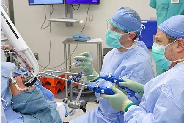 可彎曲機(jī)器人The Flex 就如其名所示,是一種柔性管狀機(jī)器人。醫(yī)生將其插入患者的嘴巴,通過(guò)操縱桿來(lái)控制其移動(dòng)。醫(yī)生可通過(guò)前端有的攝像頭在患者氣管內(nèi)移動(dòng)機(jī)器人。因其可看到并到達(dá)非常難到達(dá)的解剖區(qū)域,諸如Goldenberg一樣的外科醫(yī)生開(kāi)始使用可彎曲機(jī)器人The Flex進(jìn)行手術(shù),這樣就不用在患者下巴或其他位置進(jìn)行切口手術(shù)了。Goldenberg說(shuō)這種方式不僅手術(shù)快速便捷,醫(yī)療成本更低,同時(shí)還不會(huì)給患者留下創(chuàng)口。