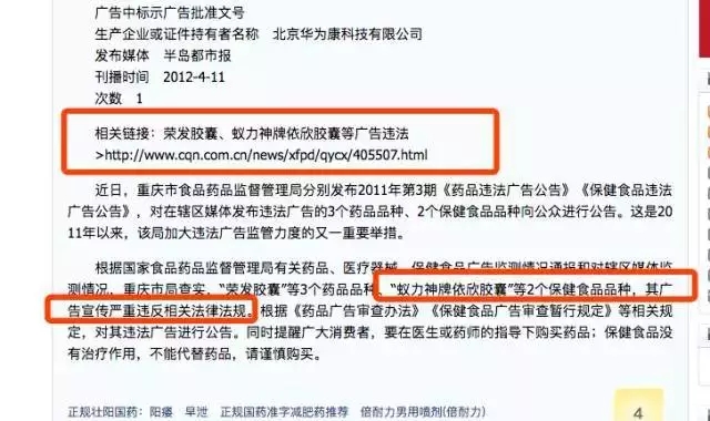 小編百度了一下,這次被通報(bào)的十個(gè)“神藥”廣告中,有不少都是多次被監(jiān)管部門掛了號的。其中號稱“降壓老土方”的“蟻力神牌依欣膠囊早在2010年、2011年多次上過“黑名單”,被監(jiān)管部門處理。而“正穎牌紅景天顆粒”也曾因菌落總數(shù)不合格,被北京市食藥監(jiān)局責(zé)令全市下架。
