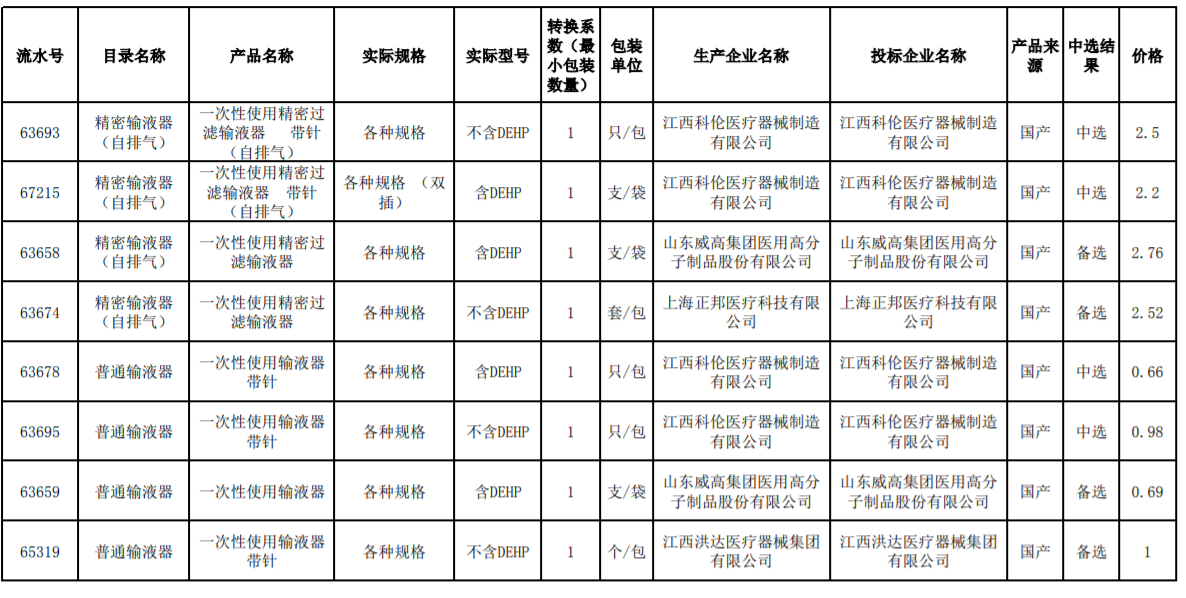 科倫醫(yī)療的某款精密輸液器(自排氣)中選價(jià)格為2.2元;