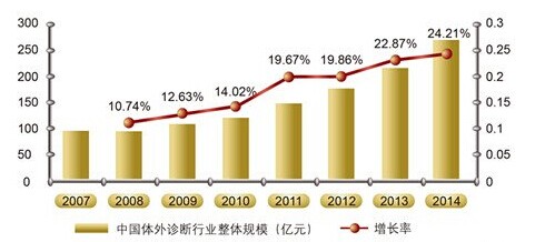 中國的體外診斷試劑行業(yè)已經(jīng)具備了一定的市場(chǎng)規(guī)模和基礎(chǔ),正從產(chǎn)業(yè)導(dǎo)入期步入成長期,該市場(chǎng)的發(fā)展前景良好。2007年到2014年,中國體外診斷市場(chǎng)規(guī)模增速顯著高于全球的平均水平,目前,進(jìn)口試劑以及診斷儀器的壟斷優(yōu)勢(shì)正在被民族產(chǎn)品打破和制約,中國體外診斷試劑產(chǎn)業(yè)發(fā)展總體表現(xiàn)出的特點(diǎn)是市場(chǎng)大,市場(chǎng)潛力更大。