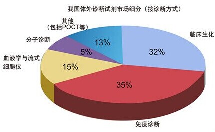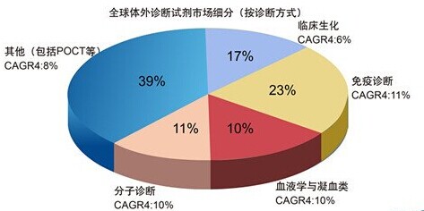 體外診斷試劑包含血液、生化、免疫、分子生物、細(xì)菌、POCT等幾大方面。從全球體外診斷試劑市場(chǎng)按照診斷方式細(xì)分,免疫診斷,臨床生化診斷以及分子診斷占據(jù)前三,發(fā)達(dá)國家的臨床生化診斷和免疫診斷市場(chǎng)已經(jīng)接近成熟,而POCT和分子診斷是診斷市場(chǎng)的主要增長點(diǎn)。中國的免疫診斷試劑,臨床生化診斷試劑是最主要的兩大體外診斷試劑市場(chǎng)。