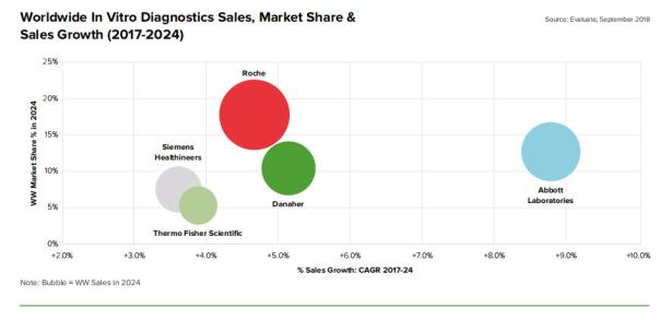 Evaluate Medtech預(yù)計,到2024年,羅氏依然在體外診斷市場占據(jù)最大的份額,市占率約17.8%。而隨著收購Alere成功,雅培有望坐上體外診斷的第二把交椅,銷售額將超過100億美元。排名第三的Danaher將依然持續(xù)在此領(lǐng)域有大的作為,今年3月,Danaher以20億美元對IntegratedDNA Technologies 發(fā)起了收購。