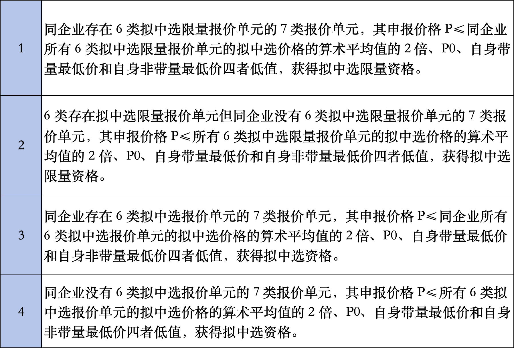 其中,在同采購品種同類別內(nèi)(1類到6類),符合企業(yè)報價要求的報價單元滿足以下條件之一的,獲得擬中選限量資格: