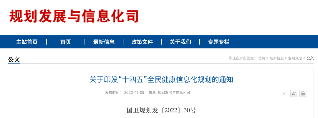 11月9日,國(guó)家衛(wèi)健委、國(guó)家中醫(yī)藥局、國(guó)家疾控局聯(lián)合發(fā)布《“十四五”全民健康信息化規(guī)劃》(以下簡(jiǎn)稱《規(guī)劃》),部署八大主要任務(wù)、五項(xiàng)重點(diǎn)工程及八大優(yōu)先行動(dòng)。