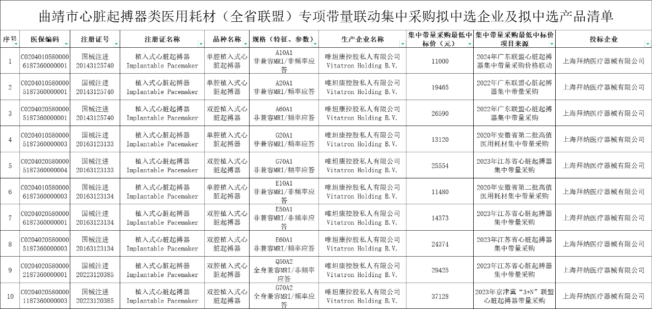 本次集采由曲靖市牽頭,云南全省參與。采購品種為心臟起搏器類、心臟除顫器類和心臟起搏除顫器配套使用的導(dǎo)線類醫(yī)用耗材,部分擬中選結(jié)果如下: