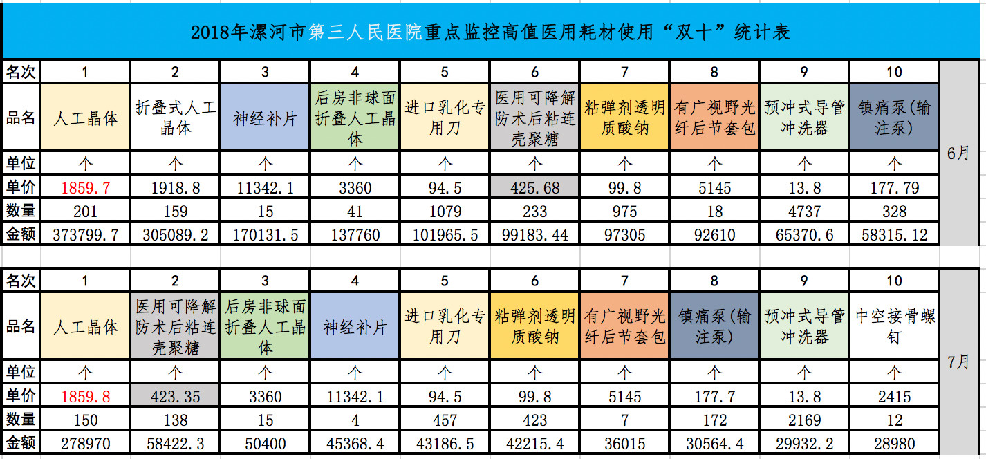 漯河市第三人民醫(yī)院6月、7月“雙十”統(tǒng)計表顯示,各月的前十名里,有9種耗材產(chǎn)品重復。即,前十名中的九個位置被固定產(chǎn)品占據(jù),可想而知這些產(chǎn)品被限用、停用的風險之大。