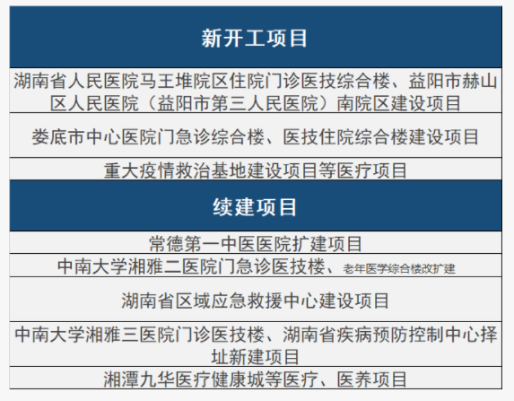 2021年湖南省重點(diǎn)建設(shè)項(xiàng)目已公布,其中醫(yī)療相關(guān)新開工項(xiàng)目以及續(xù)建項(xiàng)目包含: