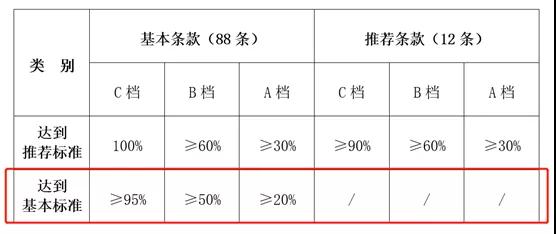新版標(biāo)準(zhǔn)總共100條,分為88條基本條款和12條推薦條款,采用ABCD四個檔次進(jìn)行記分,A檔代表“優(yōu)秀”,B檔代表“良好”,C檔代表“合格”,D檔代表“不合格”。