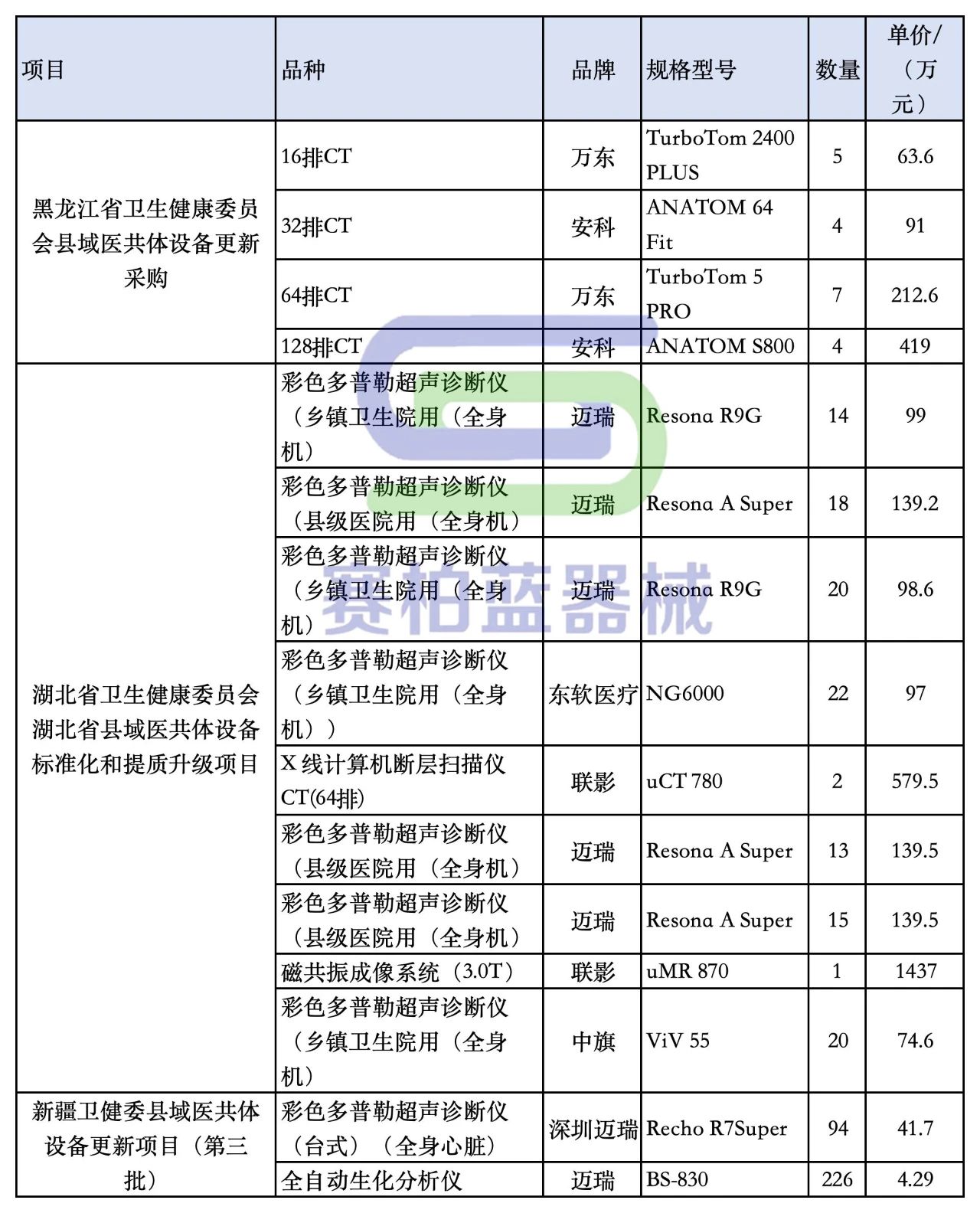 湖北省縣域醫(yī)共體設(shè)備標(biāo)準(zhǔn)化和提質(zhì)升級項(xiàng)目近期也公布了中標(biāo)結(jié)果,訂單涉及超聲、CT、磁共振等設(shè)備,邁瑞、東軟醫(yī)療、聯(lián)影、中旗中選,總中標(biāo)金額約1.6億元。