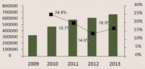 從2009~2013年的數(shù)據(jù)來看,國內(nèi)支架數(shù)量的使用仍在逐年上升,這個“蛋糕”仍在發(fā)酵膨脹,但膨脹速度有所放緩(圖3)。