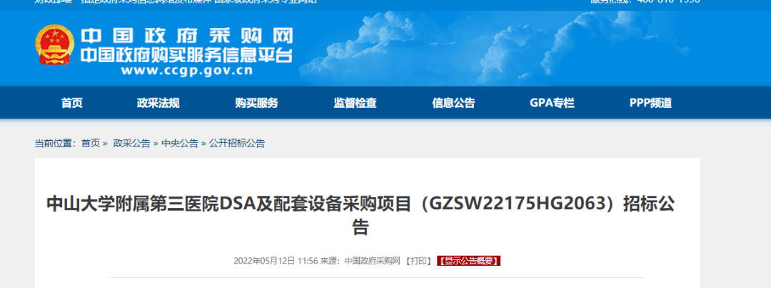 據(jù)公告了解,中山大學附屬第三醫(yī)院本次預算2300萬,采購一套設備,包括DSA及配套設備。