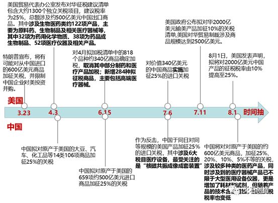 長期來看,美國發(fā)動貿(mào)易戰(zhàn)旨在針對我國“中國制造2025”重點發(fā)展高新技術(shù)領(lǐng)域,從目前對22項醫(yī)療器械類商品開始征收關(guān)稅也說明美國旨在打壓我國醫(yī)療器械產(chǎn)業(yè)的升級。因此,未來我國MRI、CT掃描儀、超聲波儀器和膝蓋植入物等多種我國重點扶持發(fā)展的高端醫(yī)療器械產(chǎn)業(yè)的發(fā)展或?qū)艿街萍s。