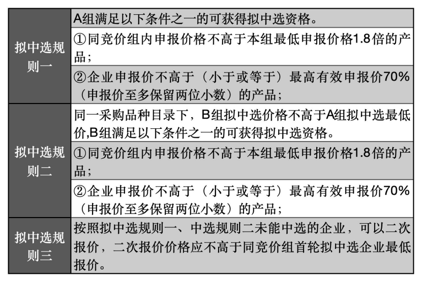 擬中選規(guī)則中,設置了二次報價規(guī)則,給企業(yè)留有一定回旋余地。根據(jù)《征求意見稿》,按照擬中選規(guī)則一、中選規(guī)則二未能中選的企業(yè),可以二次報價,二次報價價格應不高于同競價組首輪擬中選企業(yè)最低報價。