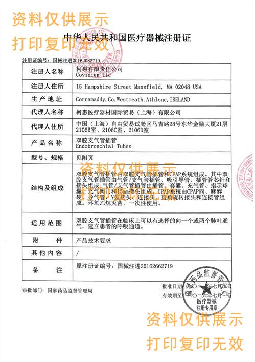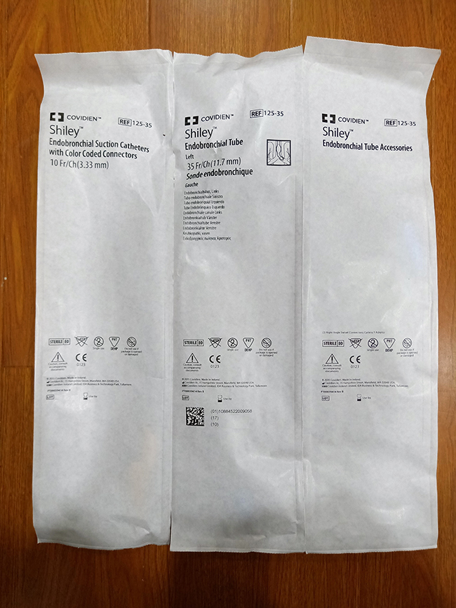 美國柯惠雙腔支氣管插管由雙腔支氣管插管和CPAP系統(tǒng)組成。其中雙腔支氣管插管由氣管/支氣管插管、吸引導管、插管管心針和接頭組成;氣管/支氣管插管由插管、套囊、充氣管、指示球囊、充氣閥門和15mm接頭組成。CPAP系統(tǒng)由CPAP閥、麻醉袋、導氣管、Y型接頭、連接頭、直角旋轉接頭和連接管組成。環(huán)氧乙烷滅菌,一次性使用